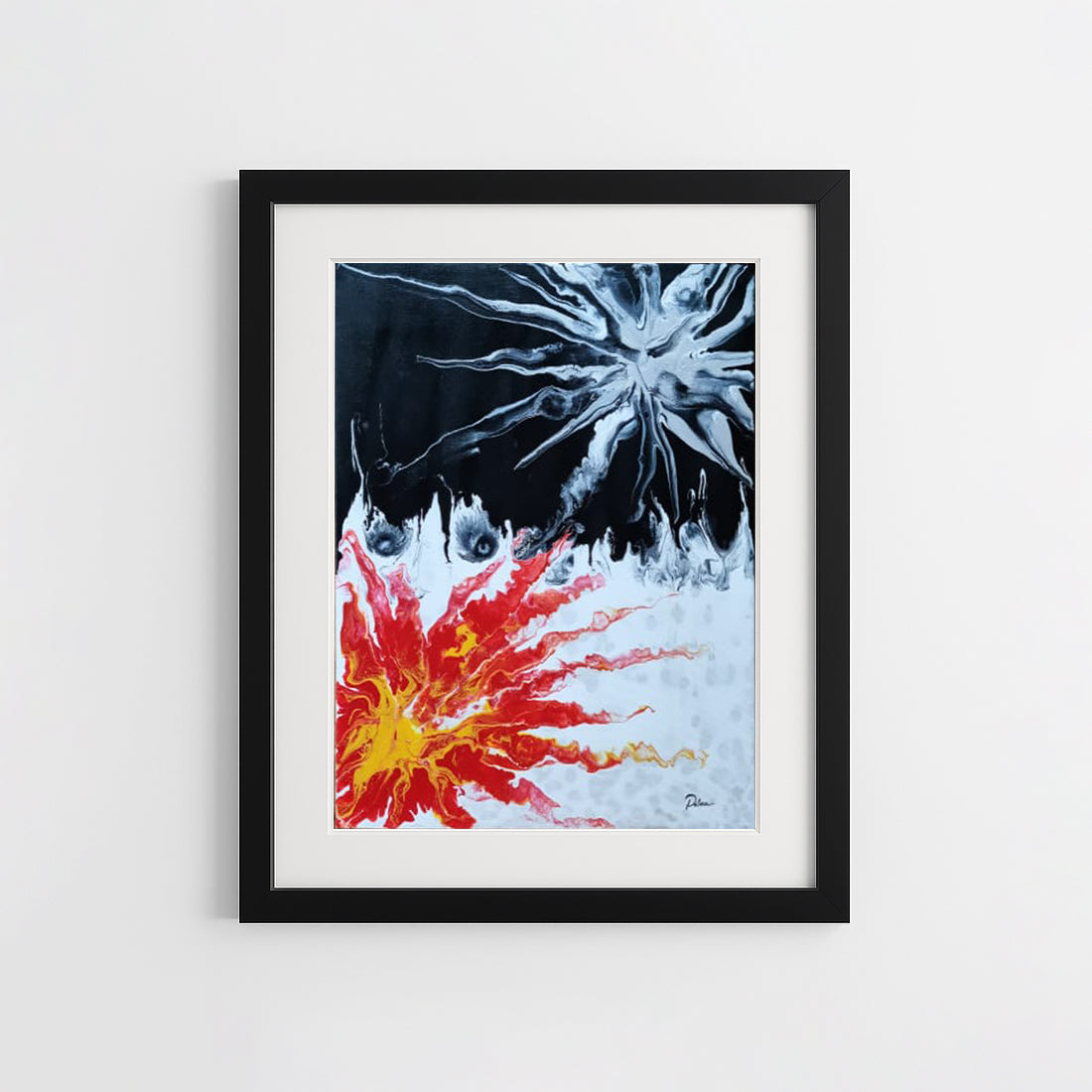 Nessa obra fiz uma releitura do conceito milenar do yin-yang. Troquei a fluidez circular por explosões dramáticas, como se cada polaridade tivesse vontade própria. Em vez do abraço sereno do yin-yang clássico, aqui há um embate. O equilíbrio ainda existe, mas ele pulsa, colide, ressoa.